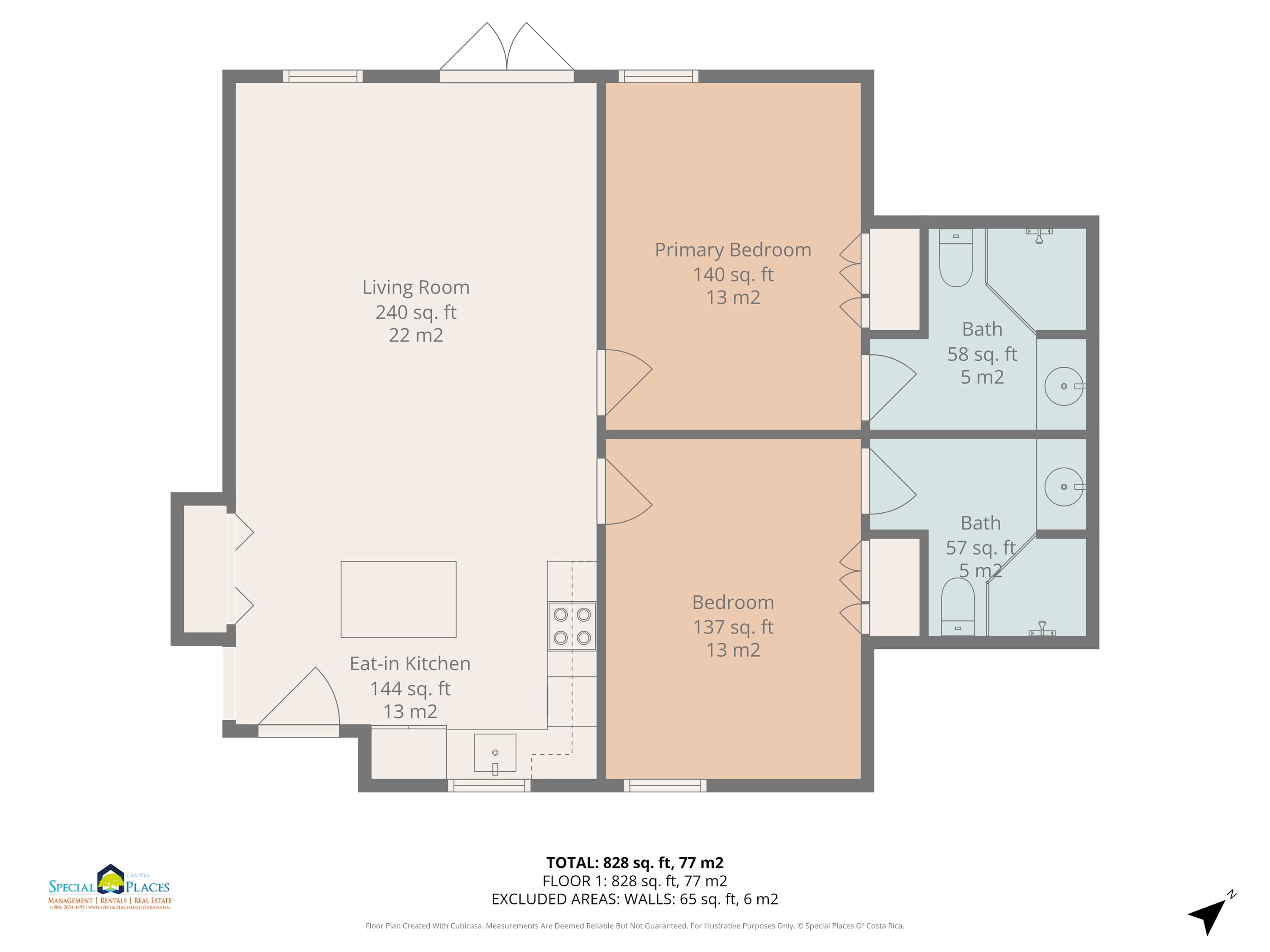 The condo offers two bedrooms to comfortably sleep four guests. The master bedroom has a plush king-sized bed, a flat-screen TV, and a private bathroom with a vanity and walk-in shower. The second bedroom has two twin beds that, upon request, can be converted into a king bed. This room also includes a flat-screen TV and a private bathroom with a vanity and walk-in shower.